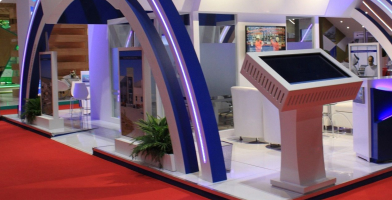 There are accessibility features of exhibition area such as wide aisles and ramps to access individual booths.
